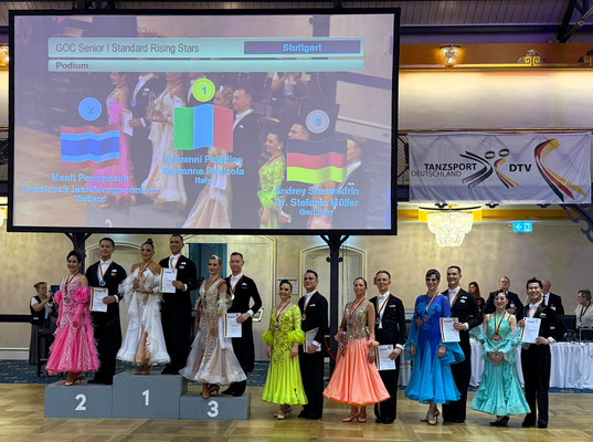 Für Stefanie & Andrey hieß es, das Semifinale im WDSF Open Standard Senior I fest im Blick zu halten. Vielleicht fehlte ein bisschen die Lockerheit - oder aber das letzte Fünkchen Spannung, aber ein guter 25. Platz (53) tröstet nur wenig über die knapp verpasste Runde der besten 24. Am darauffolgenden Tag war dann Angriff angesagt - mit einem überwältigenden Ergebnis. Völlig ungläubig tanzten die Beiden im GOC Standard Senior I Rising Stars Finale mit und landeten sogar noch auf dem Treppchen - 3. (24). Whow! Beim letzten Start im WDSF Open Latin Senior I zollten unsere Beiden dem Tanzmarathon doch etwas Tribut und erreichten Platz 29 (41).