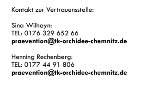 Mit diesen Maßnahmen möchten wir aktiv zu einer noch sichereren und positiveren Atmosphäre in unserem Verein beitragen. Anregungen zum Thema nehmen wir dafür gerne unter der neu erstellten Kontaktmöglichkeit praevention(at)tk-orchidee-chemnitz.de entgegen.